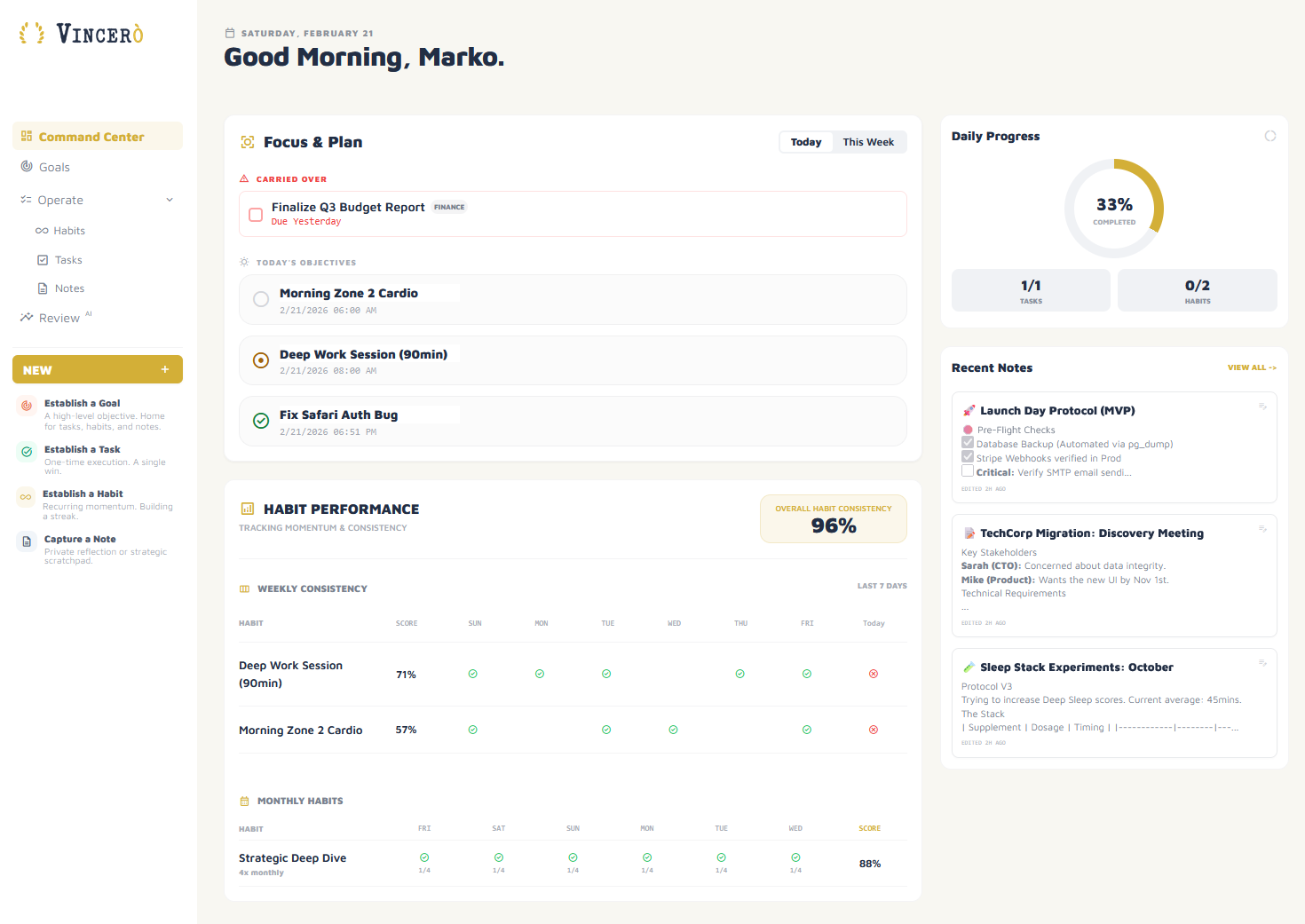 I built Vincerò to be the AI Partner I never had—an objective observer that manages everything in one view and calls me out when I drift. This system is the reason winning became my daily standard rather than a random occurrence. I built it to help you win, too."